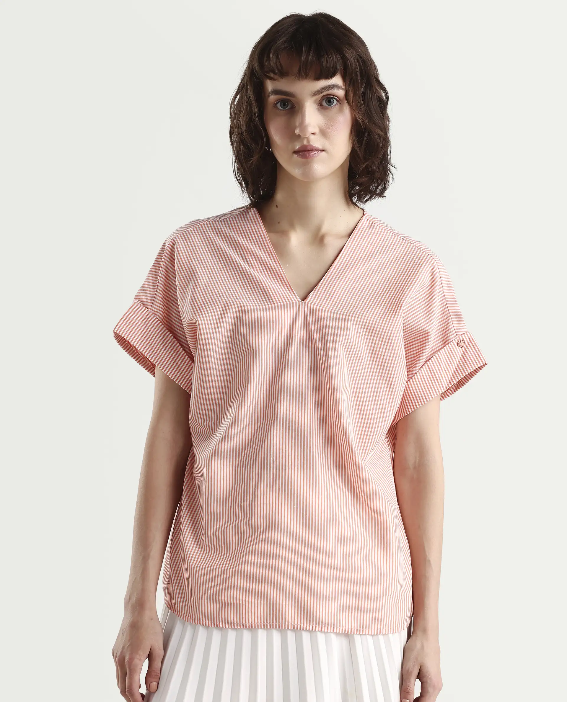 Rareism Women's Abdoo Orange V-Neck Striped Extended Sleeves Relaxed Fit Top