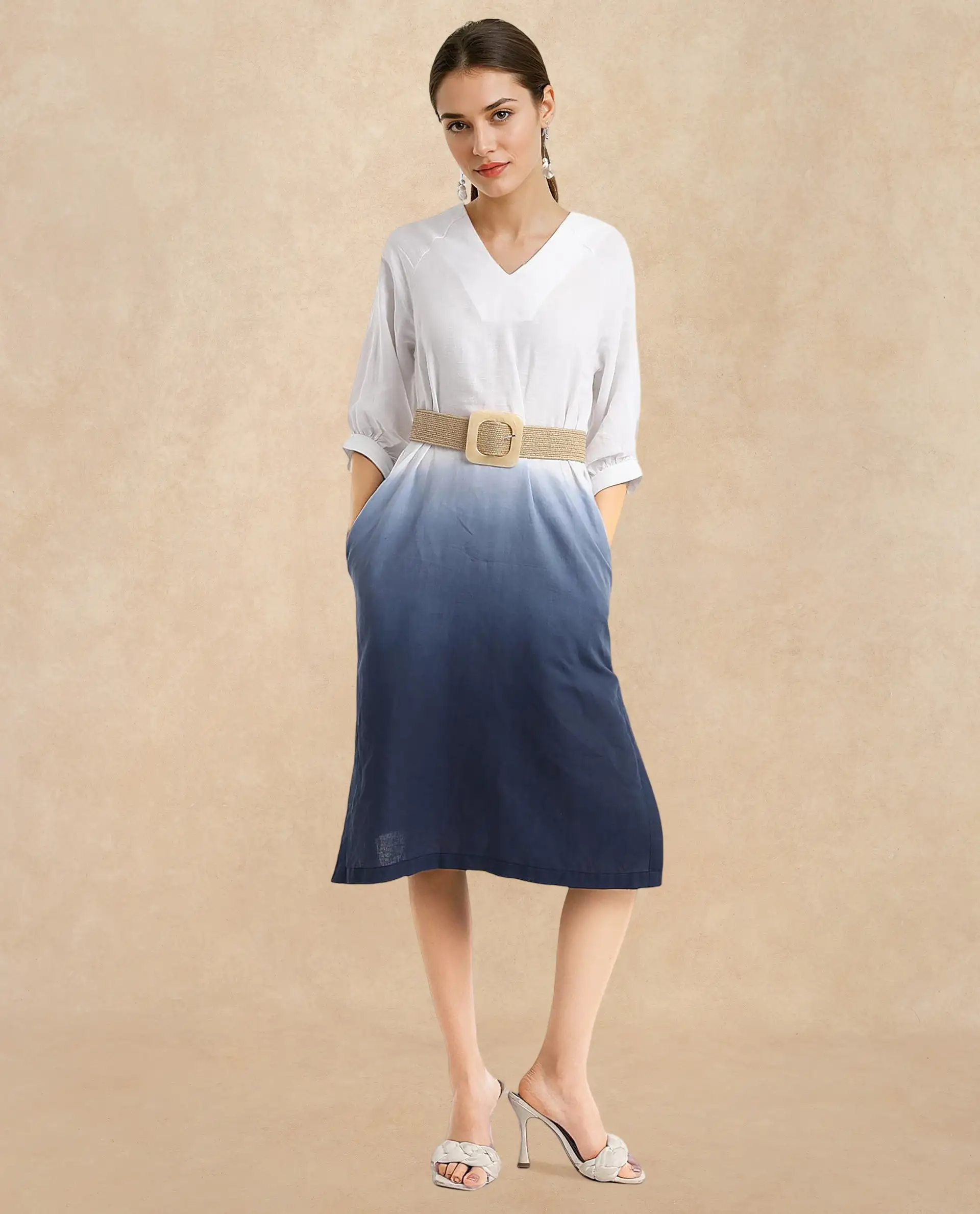 Rareism Women's Algan White Polyester Blend V-Neck Ombre Raglan Sleeve Midi Straight Fit Dress