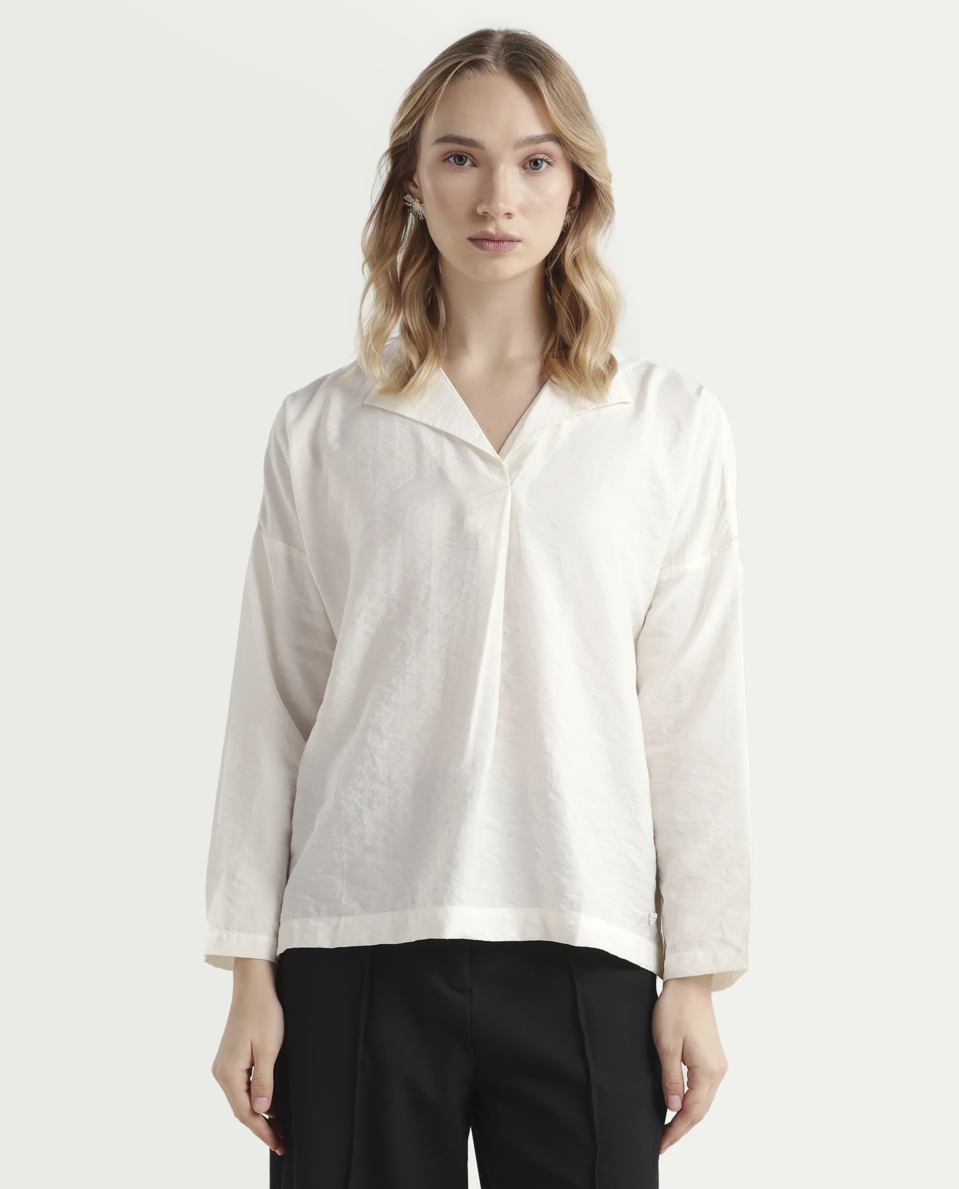 Rareism Women's Drap Off White Nylon Blend Lapel Neck Plain Relaxed Fit Top