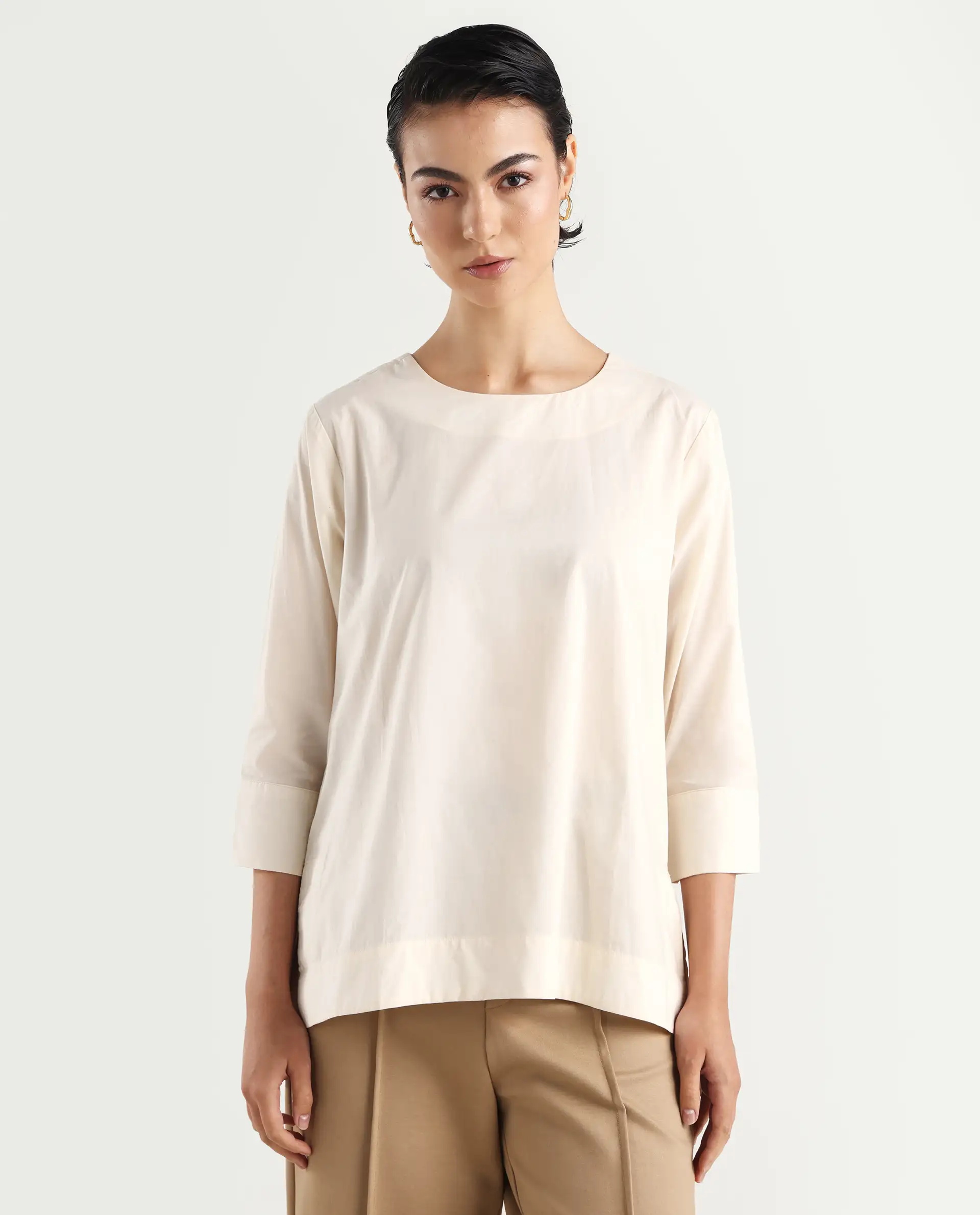 Rareism Women's Ehaan Beige Crew Neck Plain Cuffed Sleeve Regular Fit Top