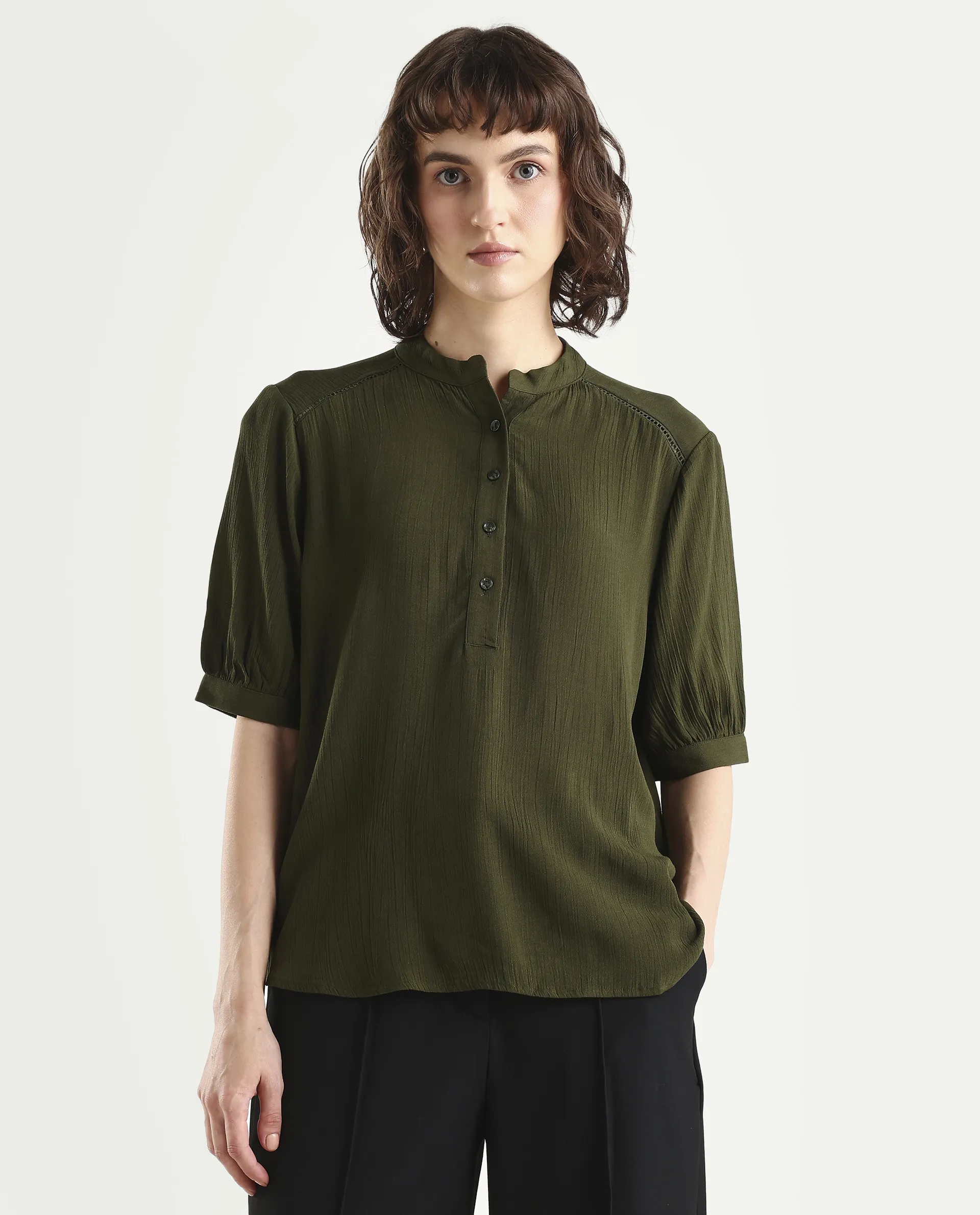 Rareism Women's Elane Olive Viscose Half Sleeve Regular Fit Plain Top
