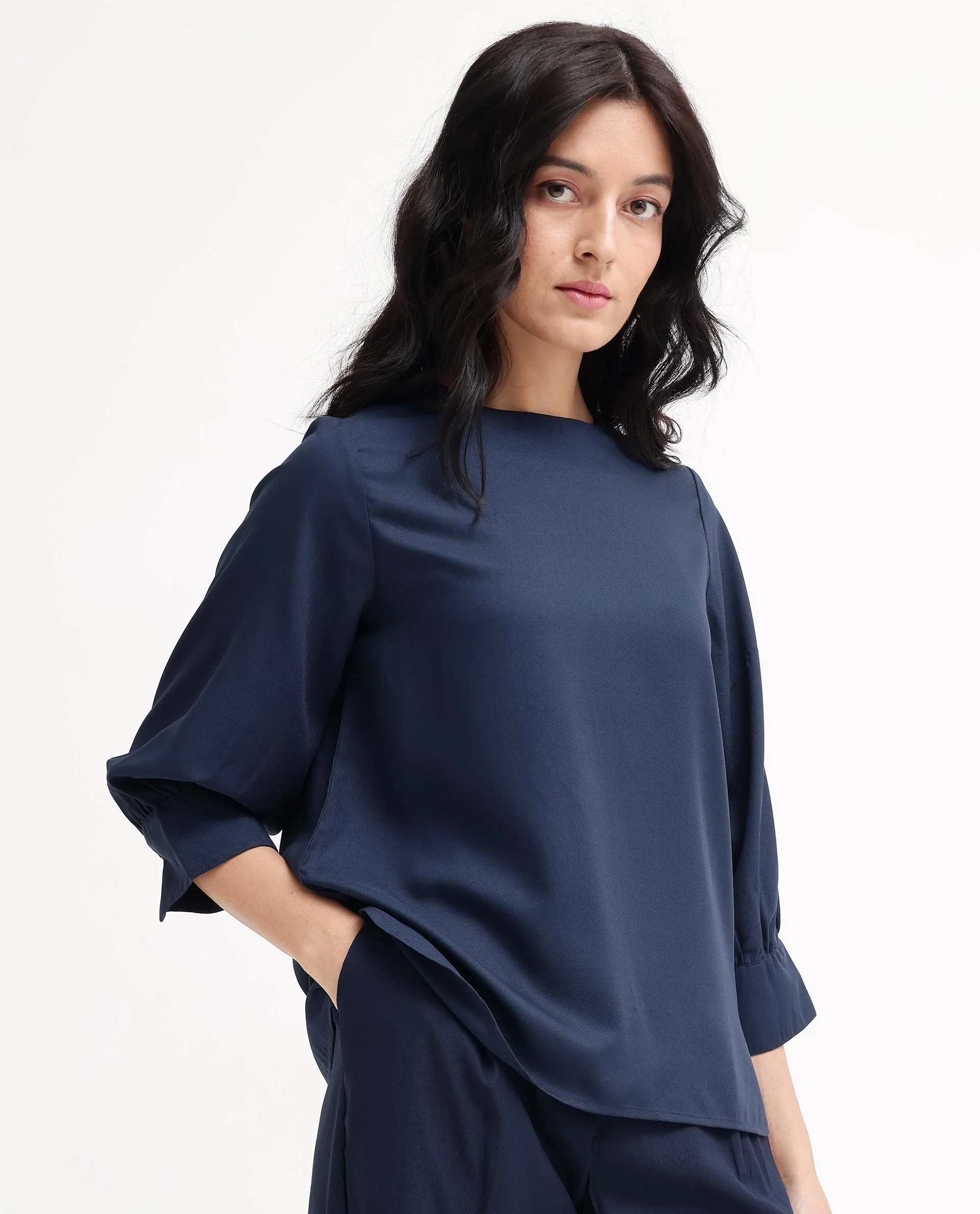Rareism Women Elara Navy Polyester Fabric Full Sleeve Round Neck Solid Regular Fit Top