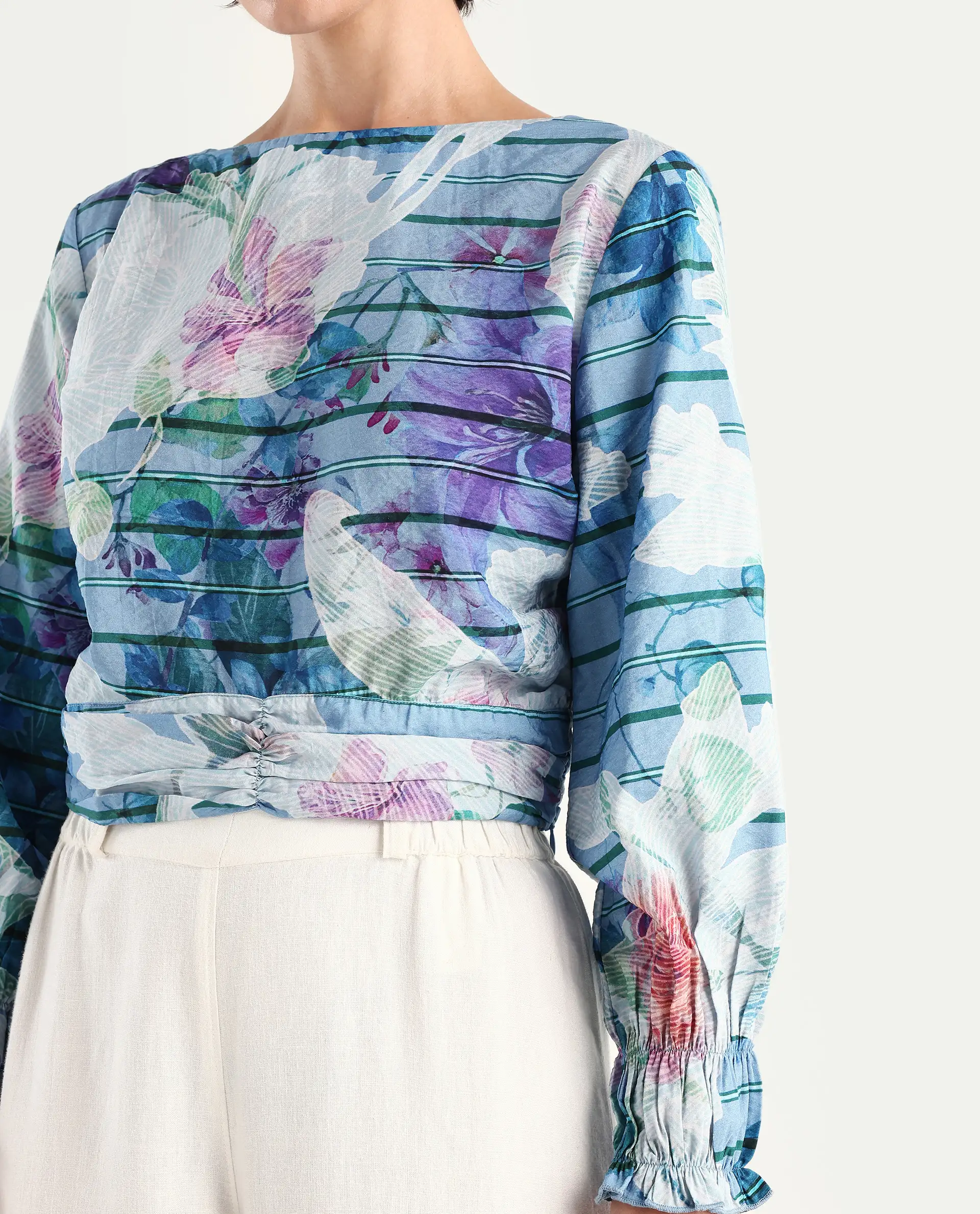 Rareism Women's Feonao Blue Nylon Blend Crew Neck Floral Print Bishop Sleeve Crop Regular Fit Top