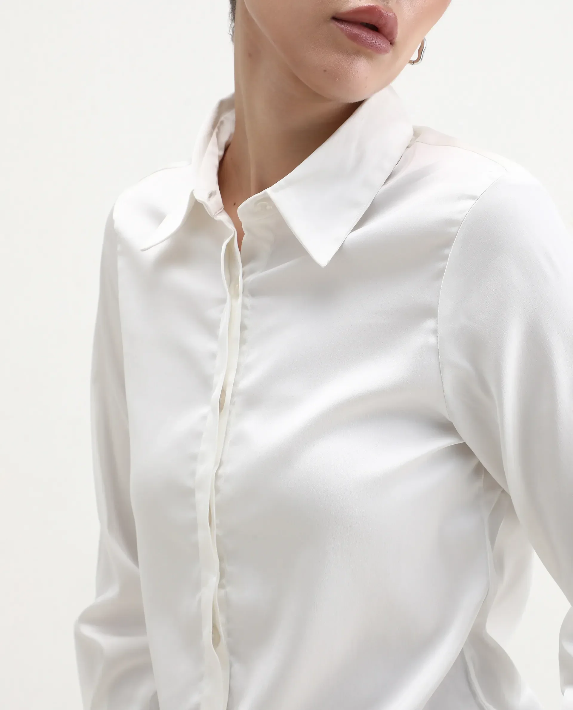 Rareism Women's Haipe White Polyester Spread Collar Plain Cuffed Sleeve Regular Fit Top