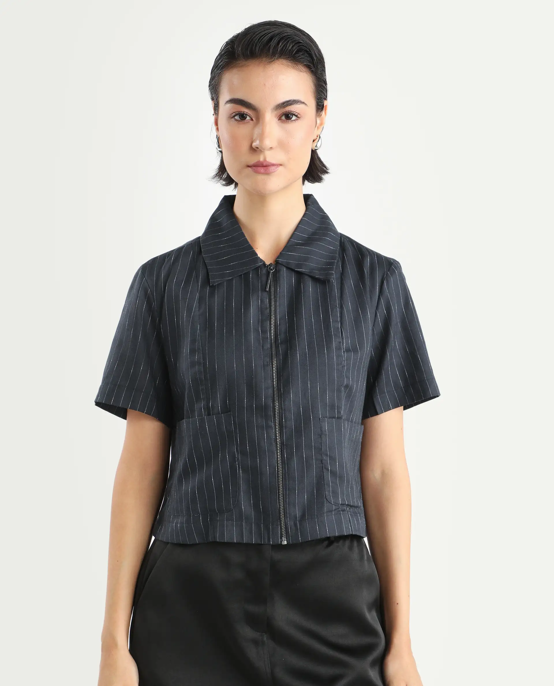 Rareism Women's Klapo Black Viscose Blend Drop Collar Striped Crop Regular Fit Top