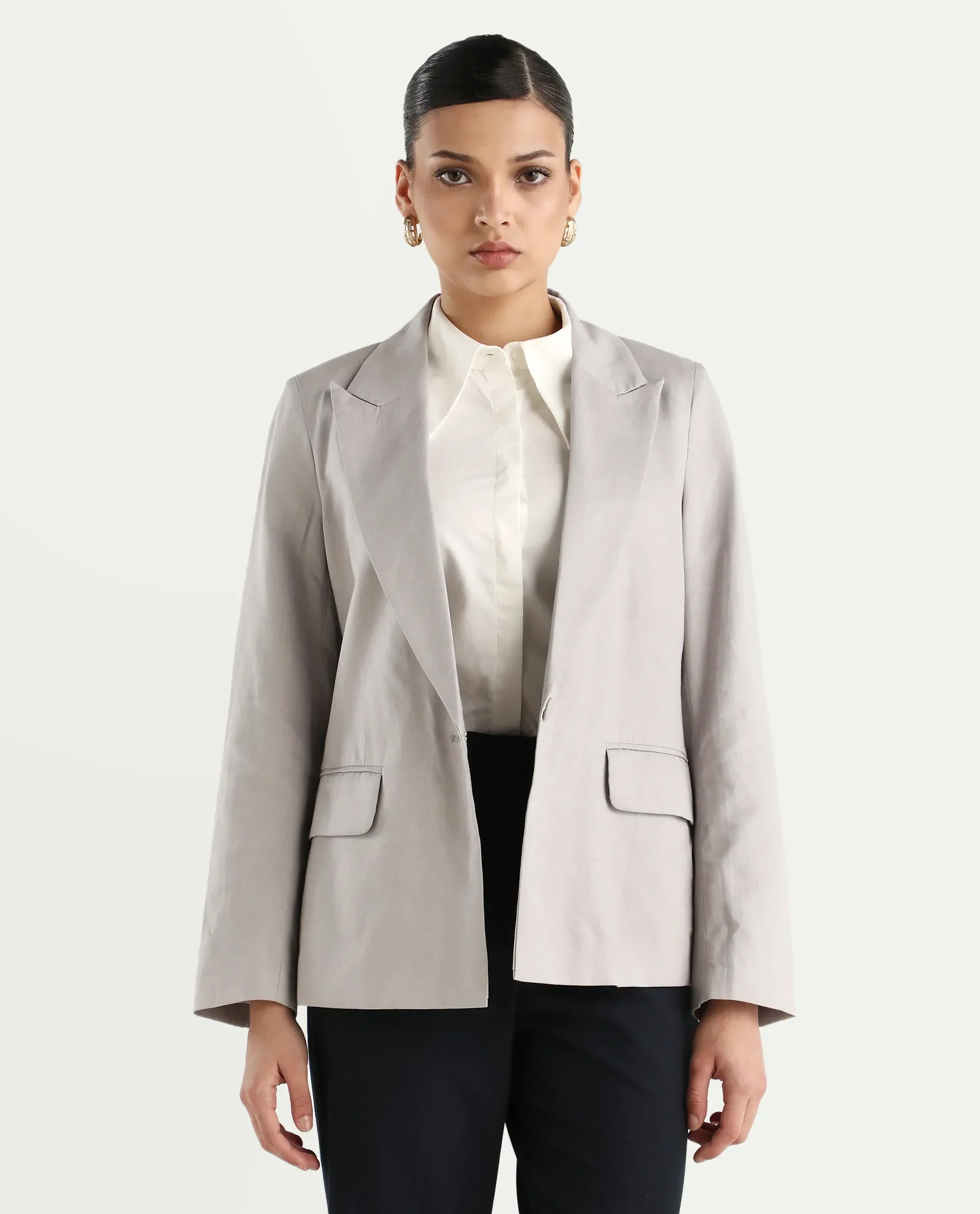 Rareism Women's Laika Grey Linen Lapel Neck Plain Regular Fit Blazer
