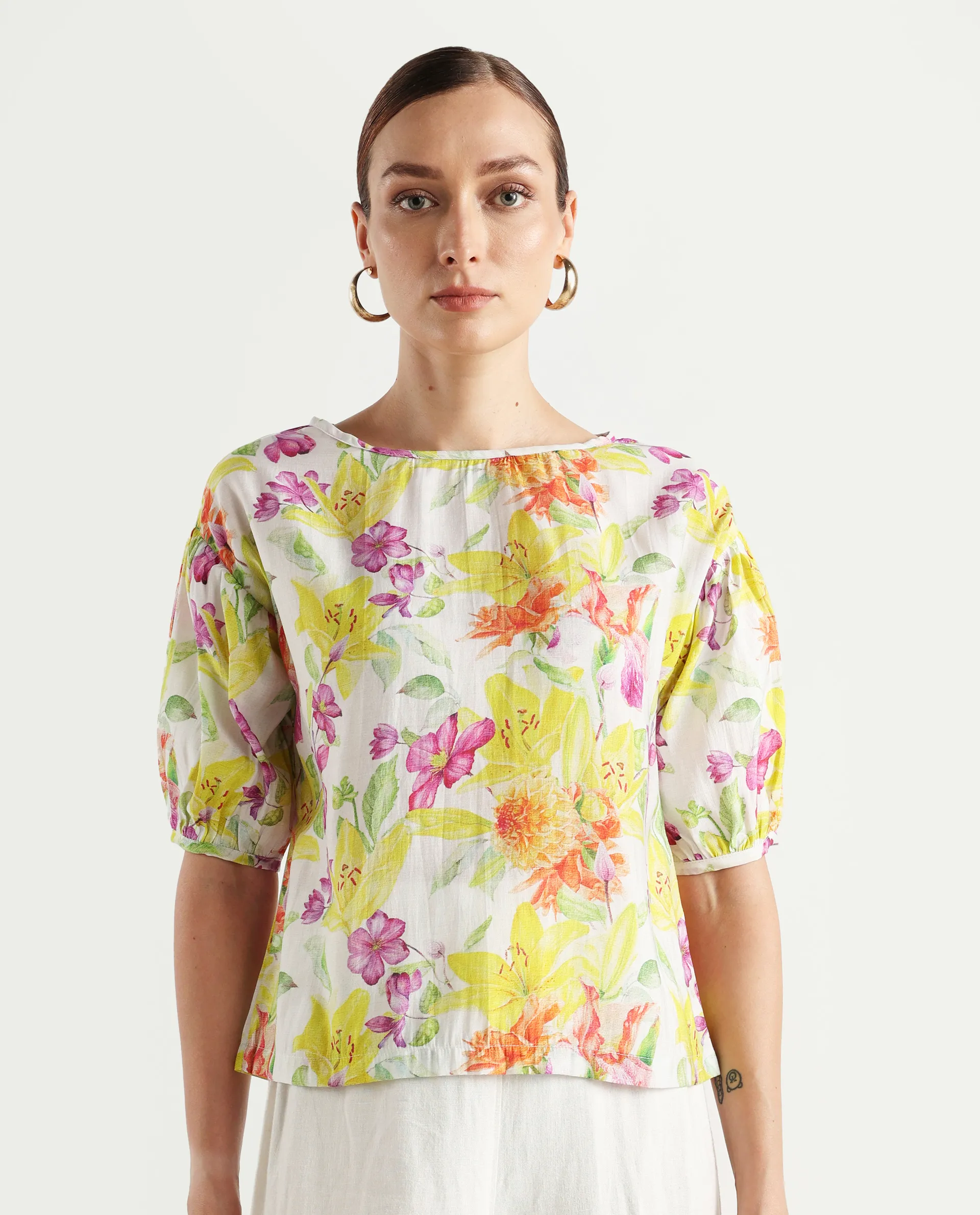 Rareism Women's Naldu Multi Viscose Crew Neck Floral Print Bishop Sleeve Boxy Fit Top