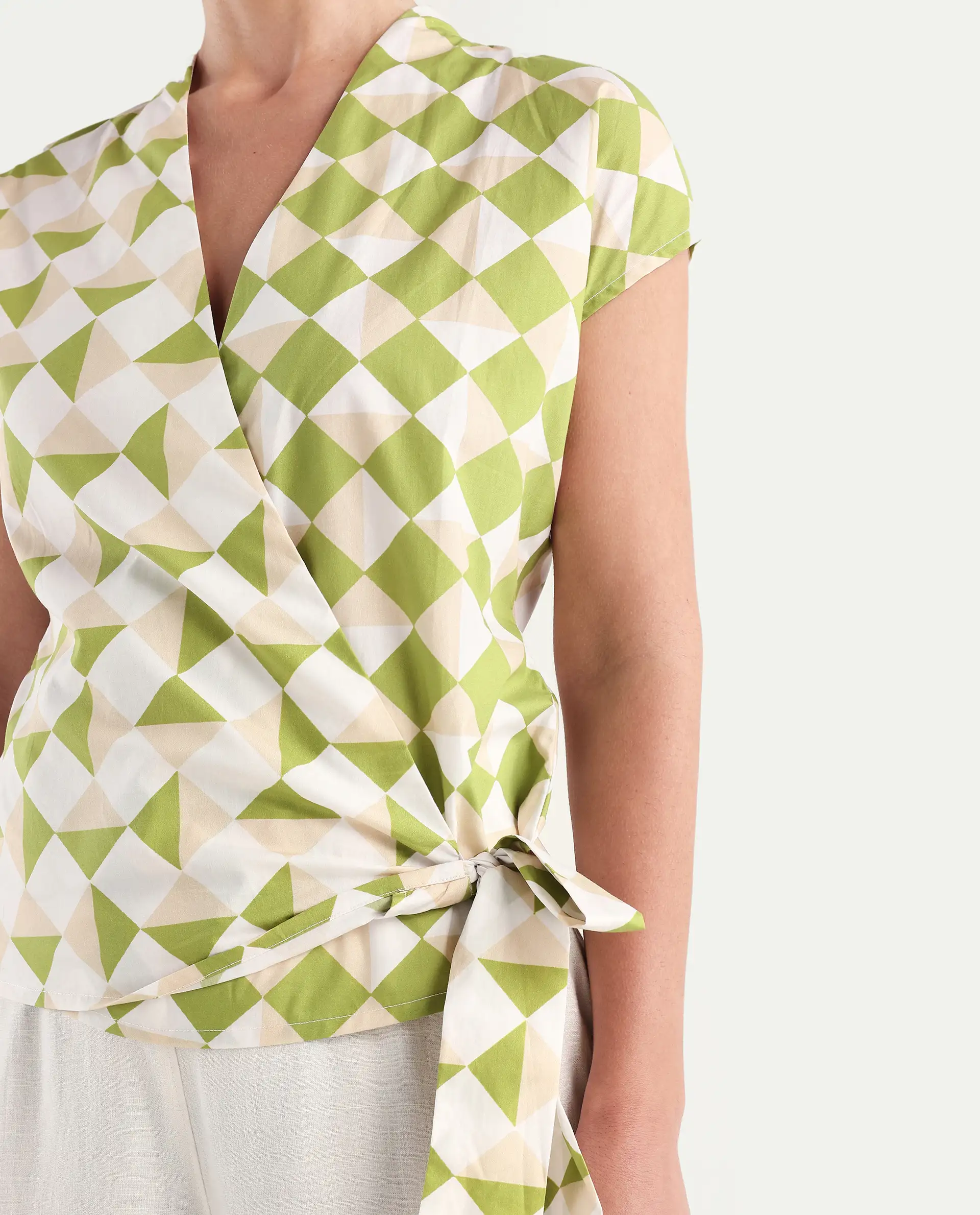 Rareism Women's Novarna Light Green Cotton Overlap Neck Geometric Print Extended Sleeves Regular Fit Top