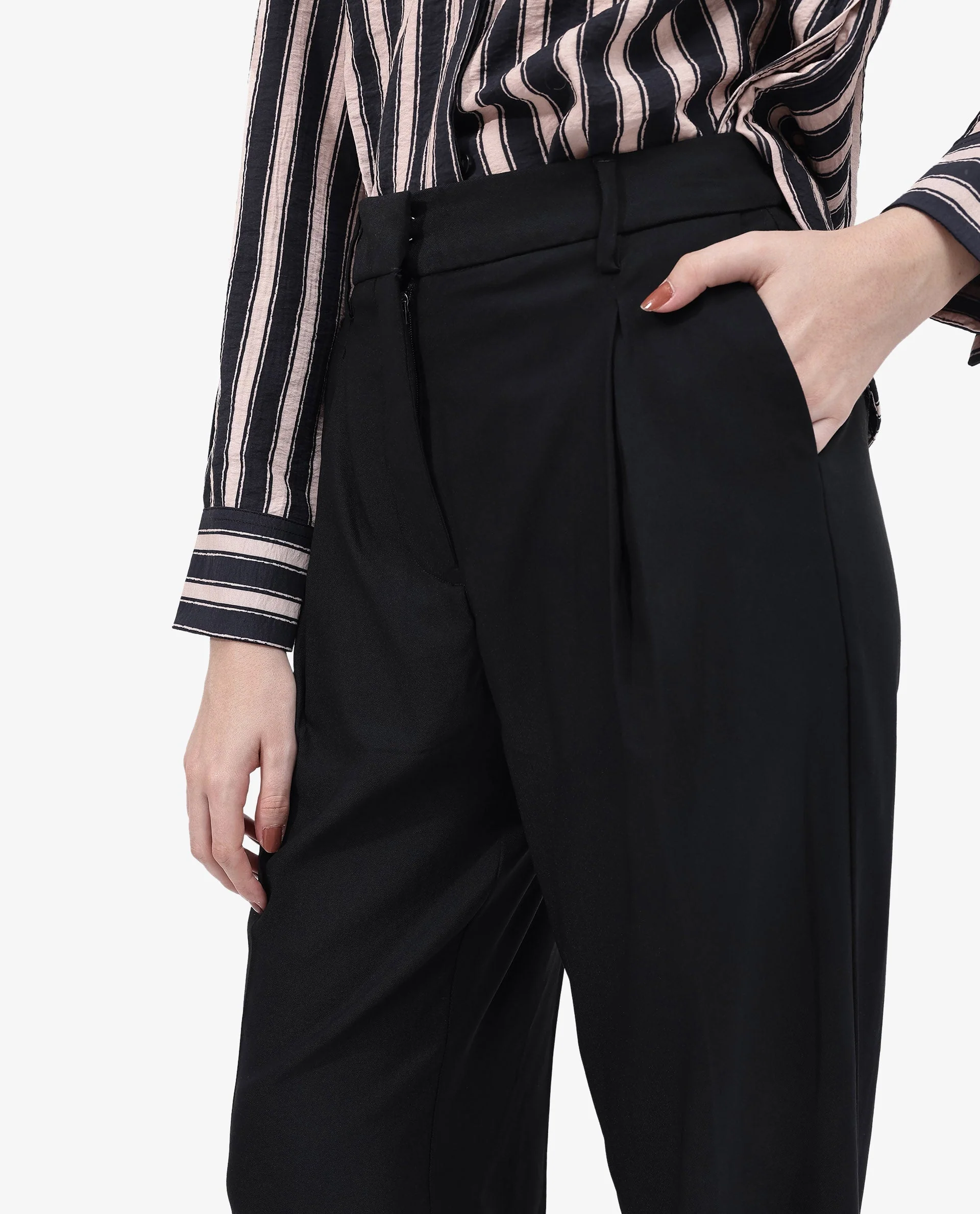 Rareism Women Nuray Black Cotton Fabric Zipper Closure Solid Regular Fit Trouser