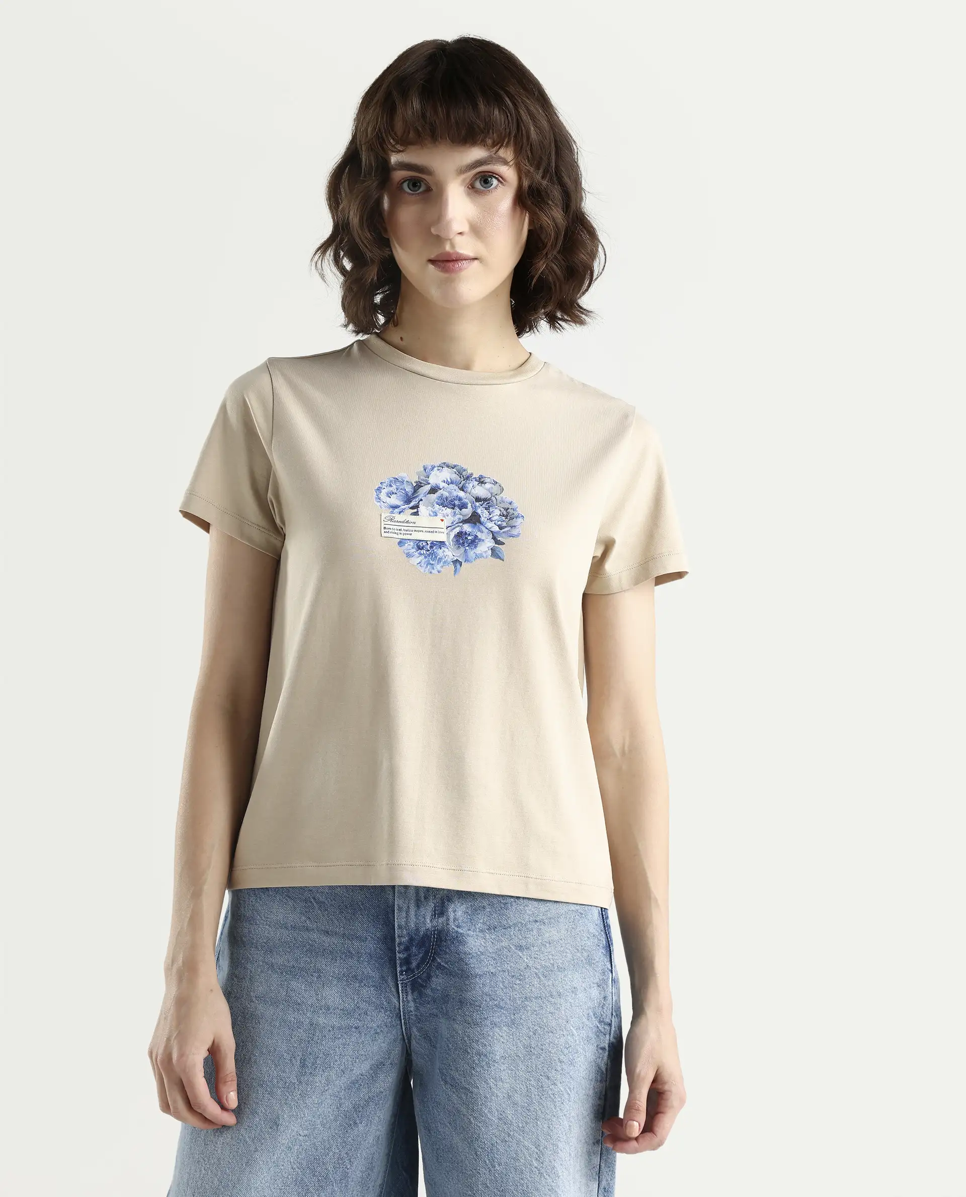 Rareism Women's Zak Beige Cotton Blend Half Sleeve Regular Fit Badge Print T-Shirt